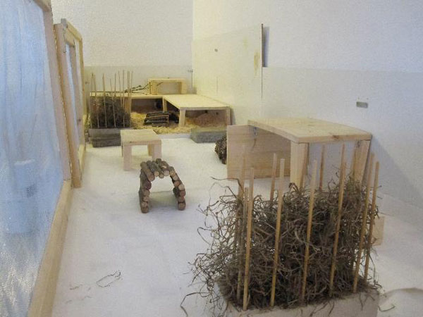 Površina nastambe se uvijek odnosi samo na najdonju površinu, a gornje etaže se ne računaju. Ako se drže grupe od 8 životinja, mora se računati na 0,5 m2 po jedinki, bez da se površina etaža računa, jer životinje moraju imati prostora za trčanje i kretanje, bez da odmah naiđu na drugu jedinku i uznemire ju.